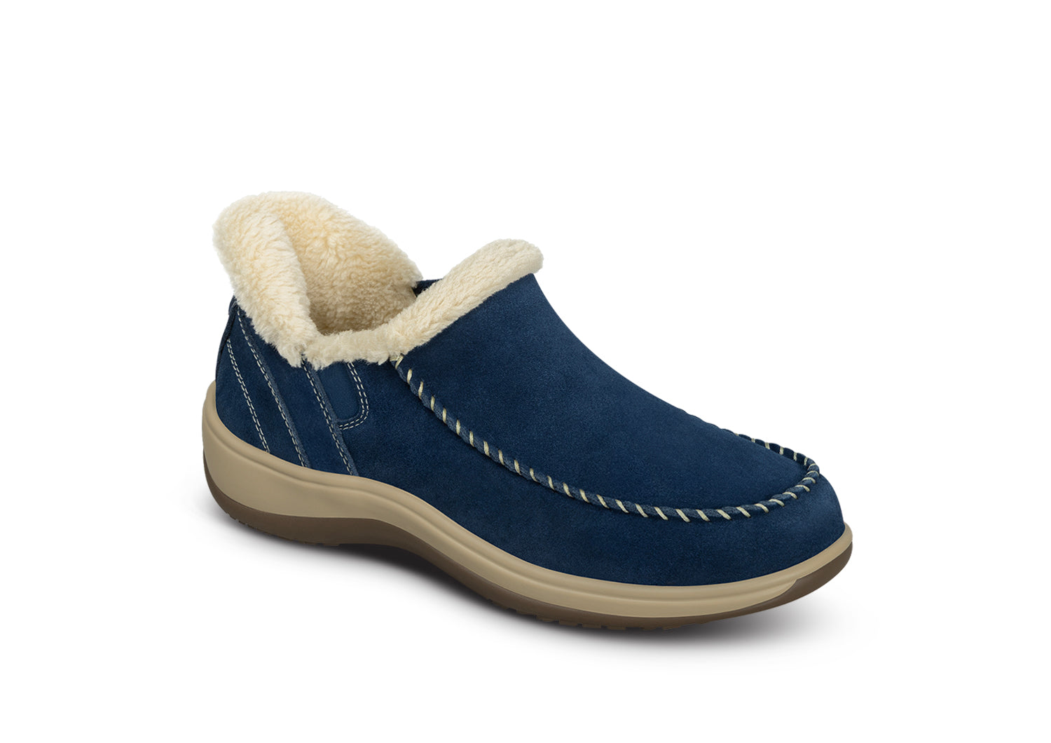Saunter indoors and venture out in the luxurious comfort of these suede slipper-shoes. No need to bend down. our revolutionary hands-free technology makes it easy to slide them on and get going. Lined with cozy faux fur. Lorin keeps feet warm and free of irritation for pain-free hours anywhere. featuring the walking support of the Ortho-Cushion™ System to soften every step.
